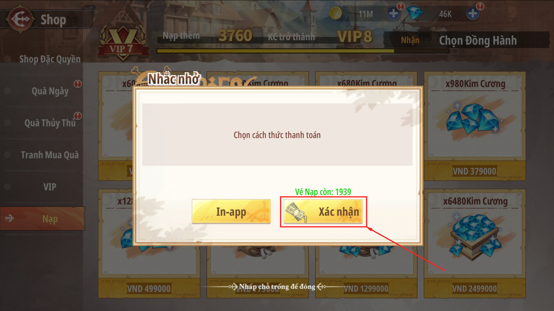 Nami sẽ hướng dẫn các Thuyền Trưởng làm thế nào để thanh toán các gói nạp trong game bằng hình thức Vé Nạp nhé.