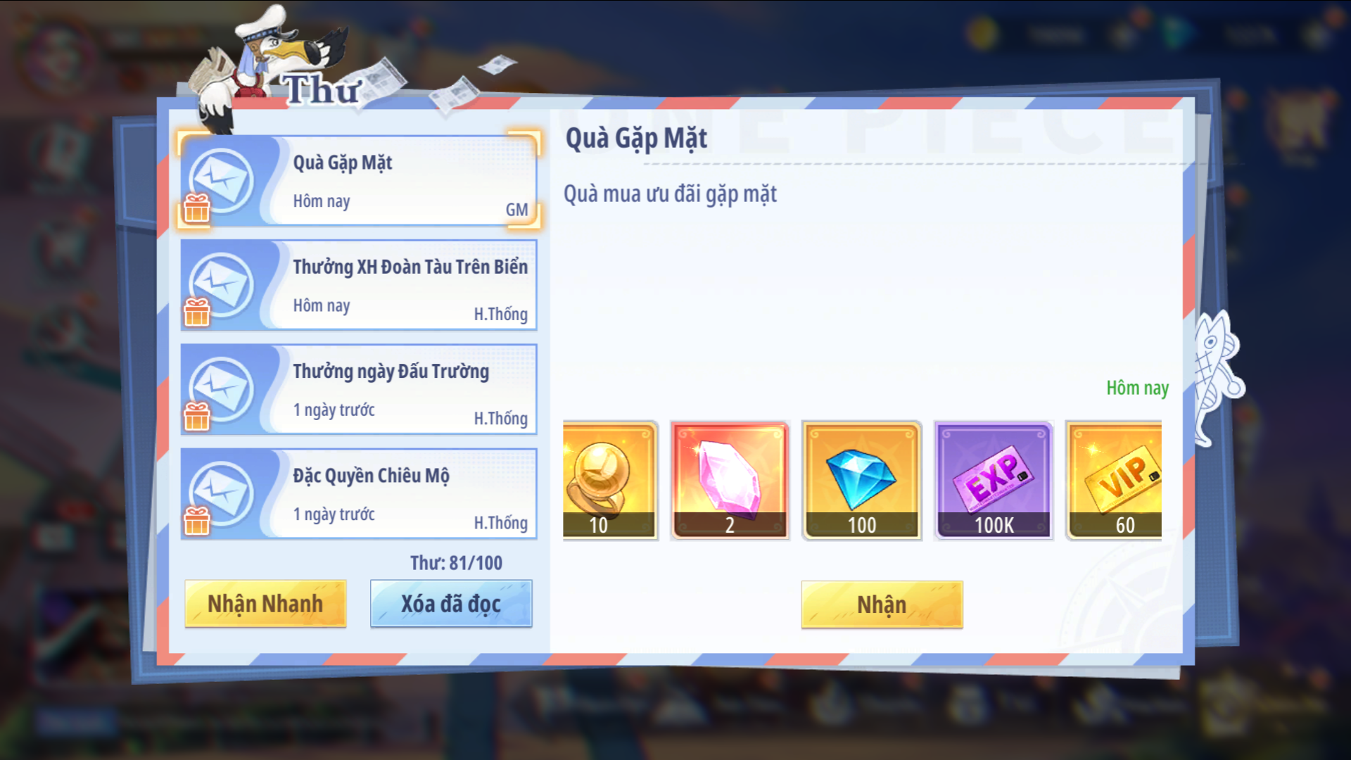 - Bước 3: Sau khi mua gói thành công, quà sẽ được gửi vào Thư Ingame theo đúng server + nhân vật đã chọn ở Bước 1.