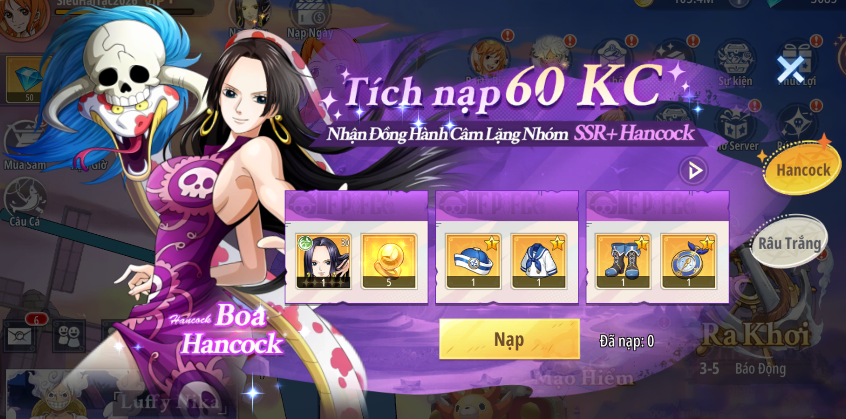 - Quà Nạp Đầu nhận Boa Hancock, sau khi Thuyền Trưởng thanh toán gói nạp bất kỳ, giao diện chính sẽ xuất hiện banner nhận quà.