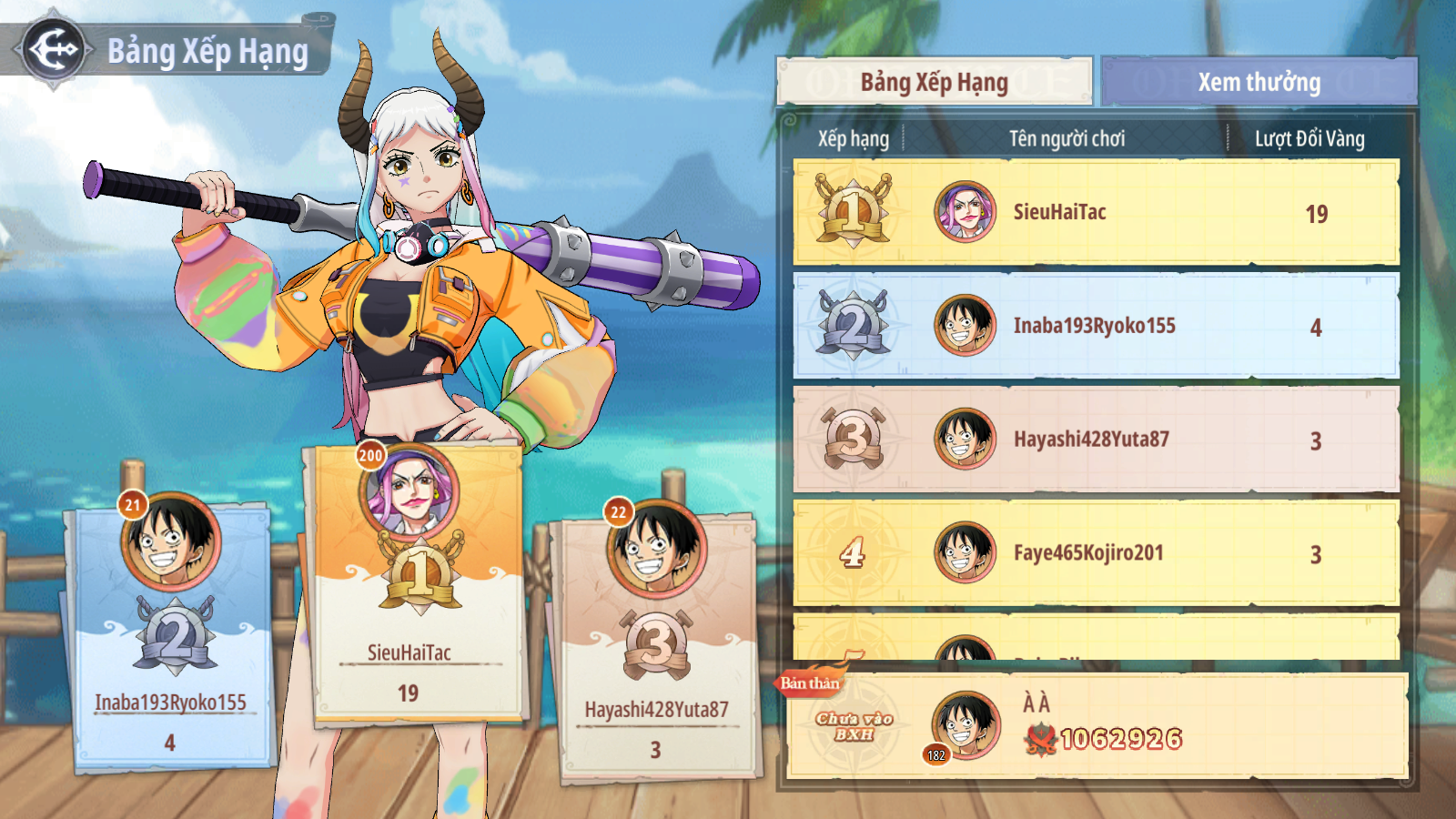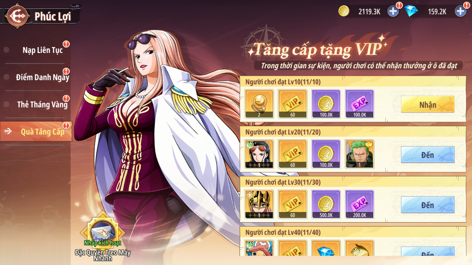 - Các phần thưởng của Thuyền Trưởng gồm: Đạt mốc level 20 nhận ngay Đồng Hành Robin - 5 sao + Thời Trang Hỏa Quốc Kiếm Phong - Zoro New World (7 ngày)
