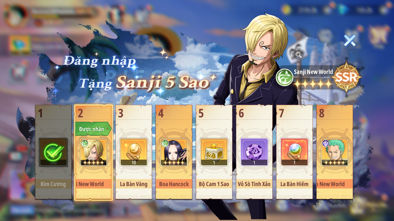 - Ngày 2 nhận: Sanji New World - 5 Sao.