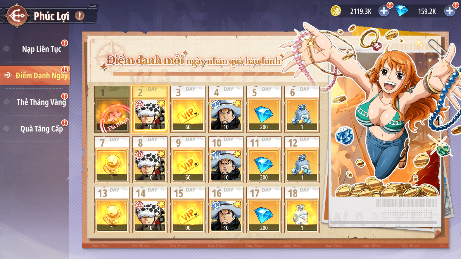- Các phần thưởng giá trị như: 1300 Kim Cương, 420 EXP VIP miễn phí , Mảnh Đồng Hành Lucci và Law, kèm thêm các tài nguyên giá trị...