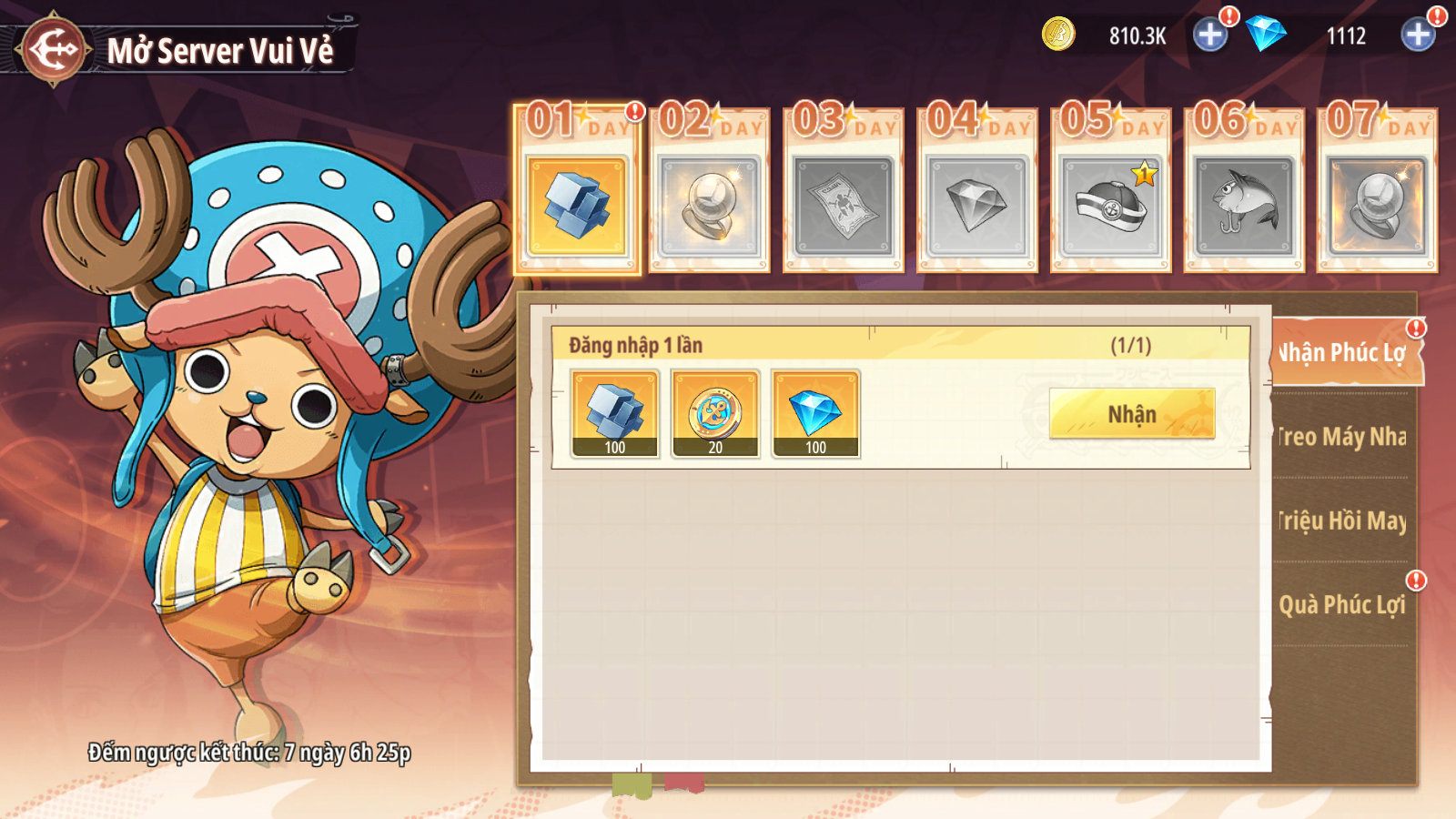 - Hoàn thành chuỗi nhiệm vụ theo ngày nhận thêm Huy Hiệu May Mắn (dùng để tham gia sự kiện Quà Mở Server có cơ hội nhận Đồng Hành Chủ Lực: Râu Trắng).