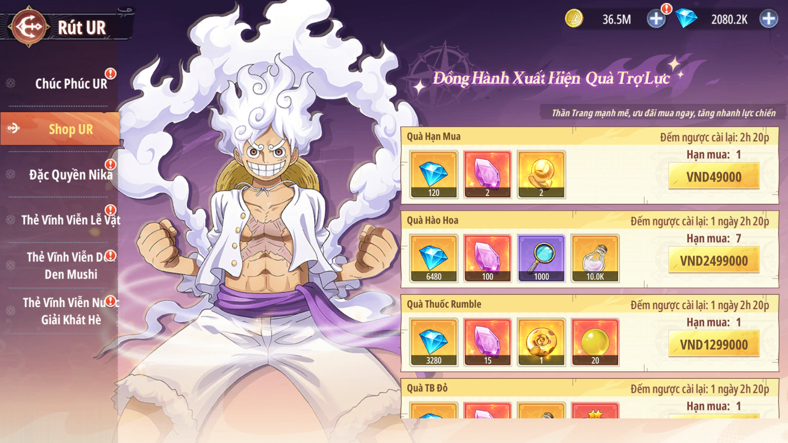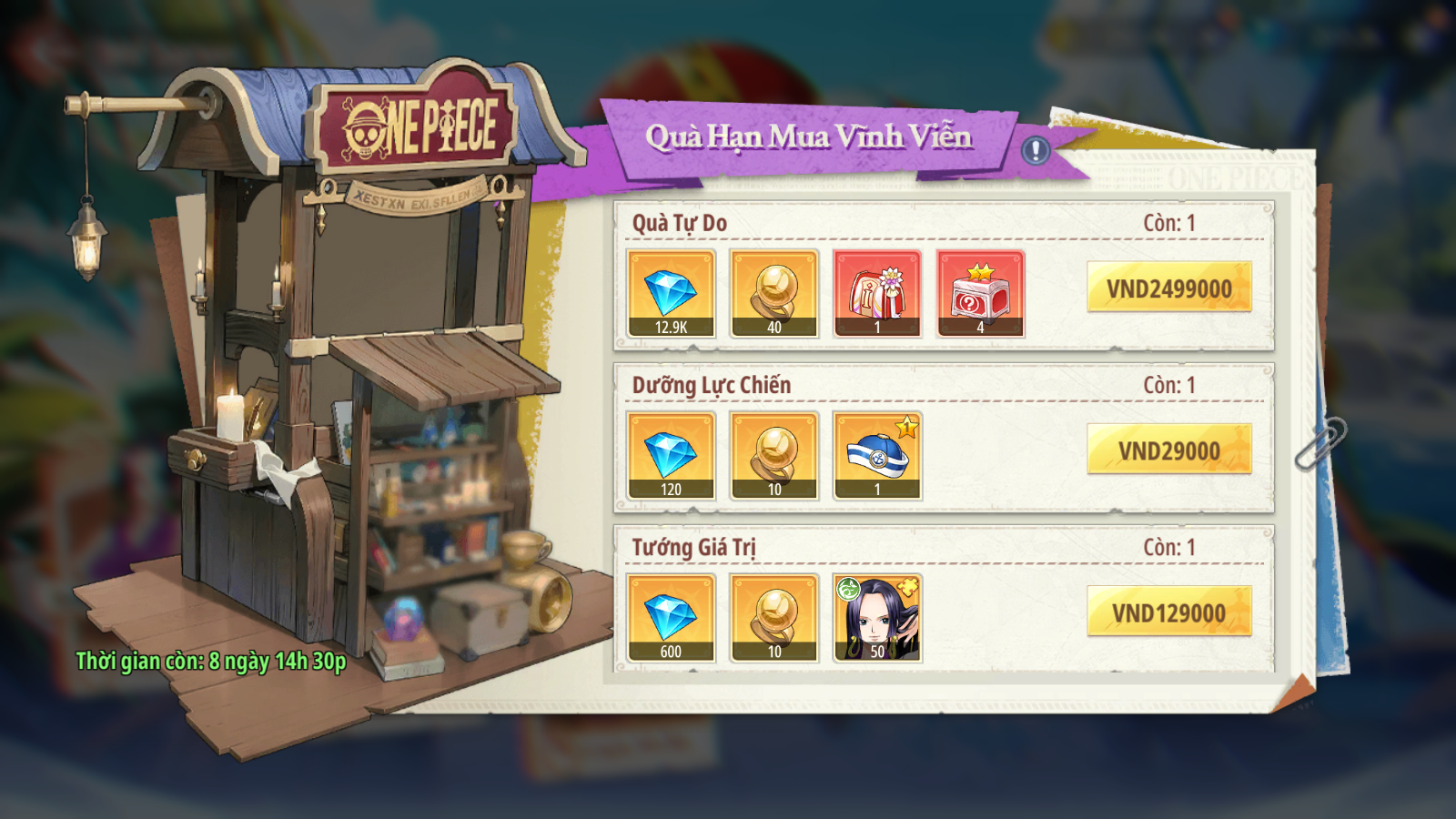 - Các gói quà giá ưu đãi hỗ trợ các Thuyền Trưởng tăng cấp trải nghiệm, với các phần quà như sau: Lõi Hủy Diệt Sáng, Túi Đỏ Ngẫu Nhiên 2 Sao, Mũ Thủy Thủ ( cam), Mũ Quý Ông ( Đỏ ), Mảnh tướng Đồng Hành 5 sao, Kim Cương…