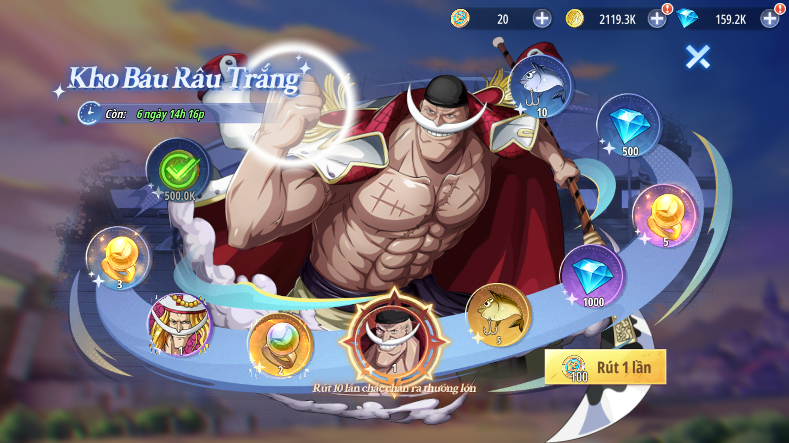 - Sử dụng Huy Hiệu May Mắn kiếm được từ sự kiện Mở Server Vui Vẻ để tham gia rút thưởng, có cơ hội nhận được Đồng Hành Chủ Lực: Râu Trắng và Thời Trang Ký Ức Wano ( 7 ngày ) - Râu Trắng.