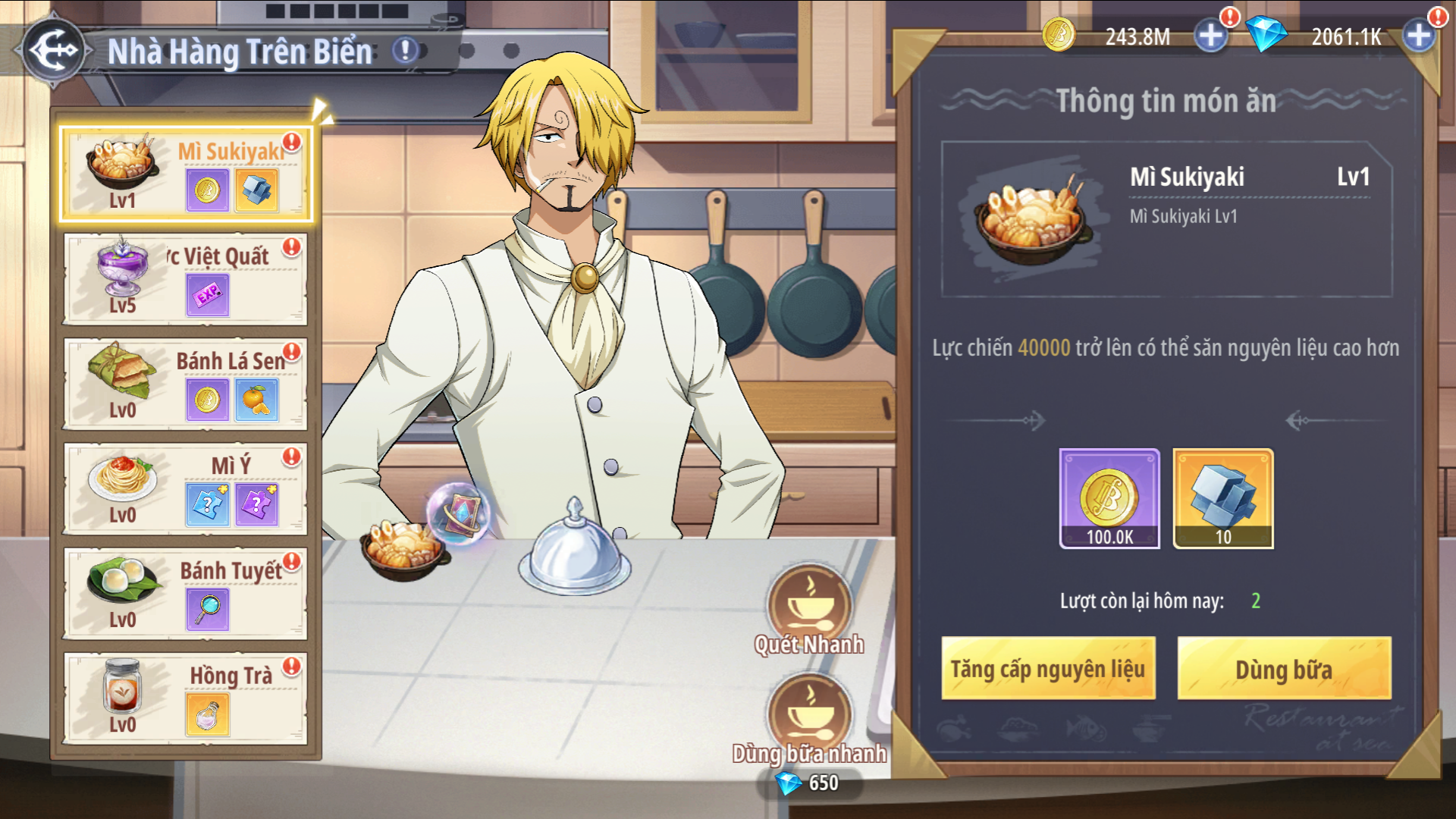 Nami xin giới thiệu tính năng Nhà Hàng Trên Biển, gặp gỡ đầu bếp Sanji với nhiều món ăn hấp dẫn.